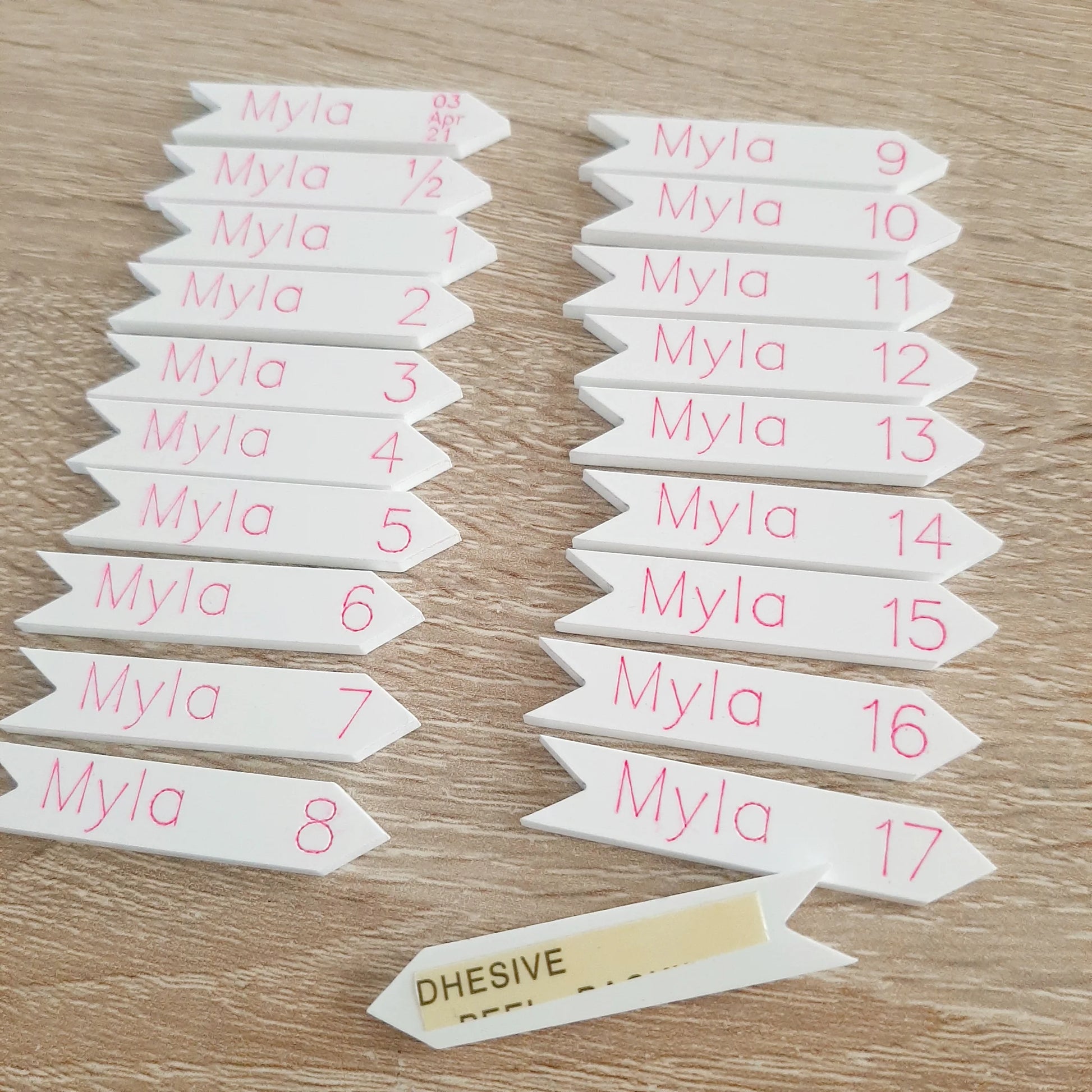 Laser cut and engraved from white acrylic, then finished with your choice of colour for the text, our Name/Age Markers are easy to apply to your Wooden Height Chart with a self-adhesive backing. Just peel and stick!